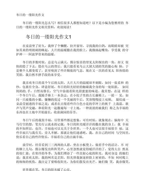 在冬天,我们总是习惯于望向天空,等待那一缕阳光照耀下来,给我们带来一丝温暖。冬天的阳光似乎特别宝贵,因为它随时会被大雪覆盖,被灰蒙蒙的云层挡住。但当我们真正遇到这一缕阳光时,我们又会发现它的意义和价值远远超出了我们的期待。